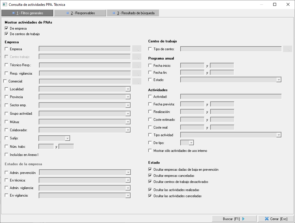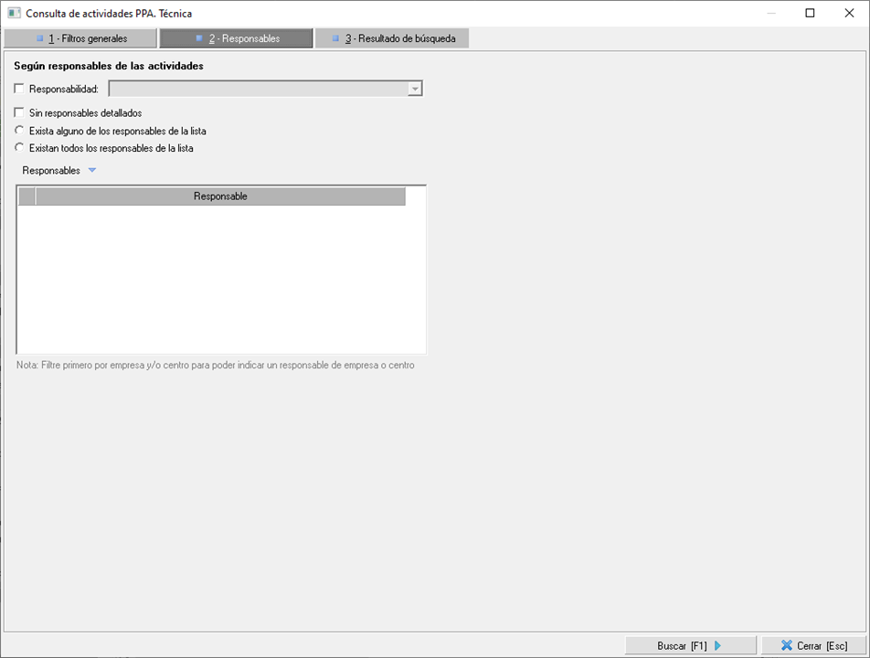 El buscador dispone de las pestañas 1 - Filtros generales y 2 - Responsables, en las que establecer los filtros a aplicar para obtener el listado resultante tras pulsar el botón Buscar [F1].