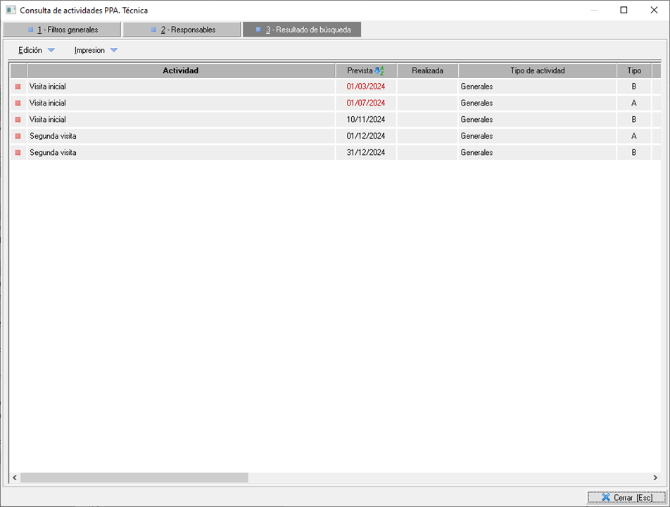 Independientemente del ítem que use, al hacer clic sobre alguna de las opciones, Vencidos, Próximos y Futuros, se mostrará el listado resultante de aplicar los filtros correspondientes de la consulta Actividades de la programación anual, permitiendo la gestión de las actividades con el menú Edición.
