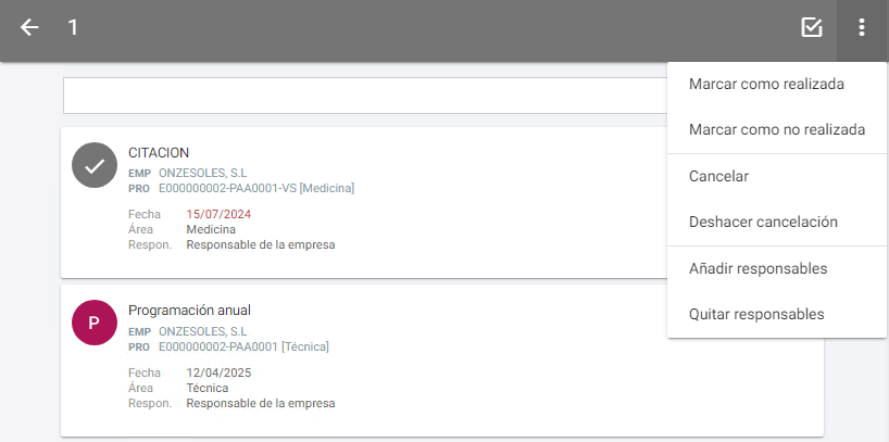como son: Marcar como realizada la actividad, marcar como no realizada, cancelar, deshacer cancelación, añadir responsables o quitar responsables.