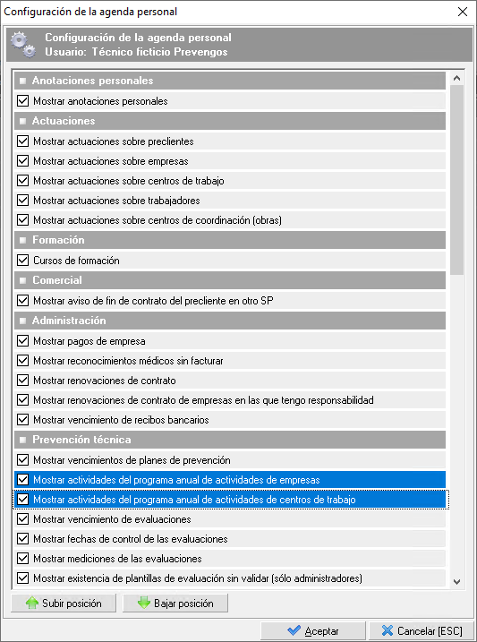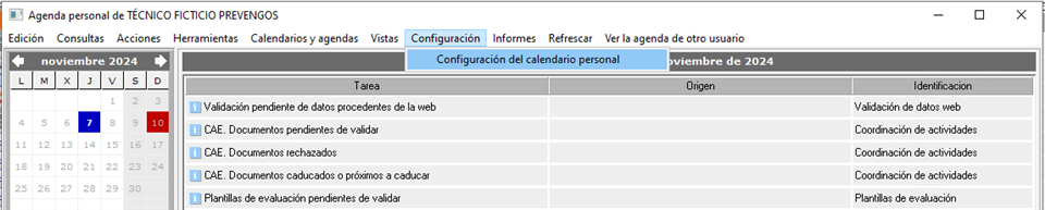 Para que la agenda muestre las actividades del PAA, hay que habilitar los items correspondientes desde el menú Configuración > Configuración del calendario personal.