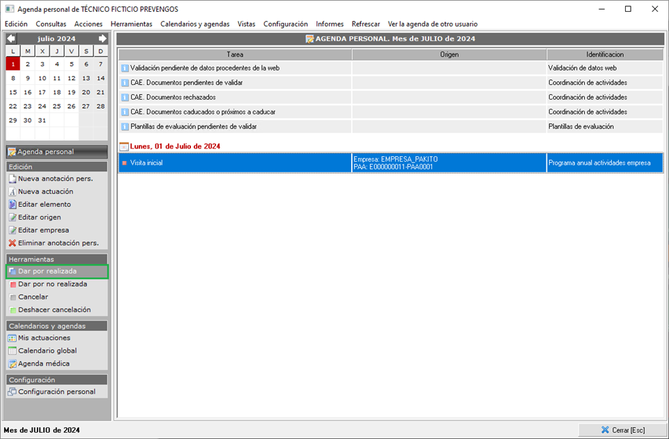- Si son usuarios de Prevengos, estas actividades les aparecerá en su agenda personal así como en la WebApp (si se tiene contratado) con el fin de que el responsable pueda realizar un seguimiento. En el caso de que no exista un responsable de dicha actividad aparecerá en el responsable técnico en la empresa en cuestión.