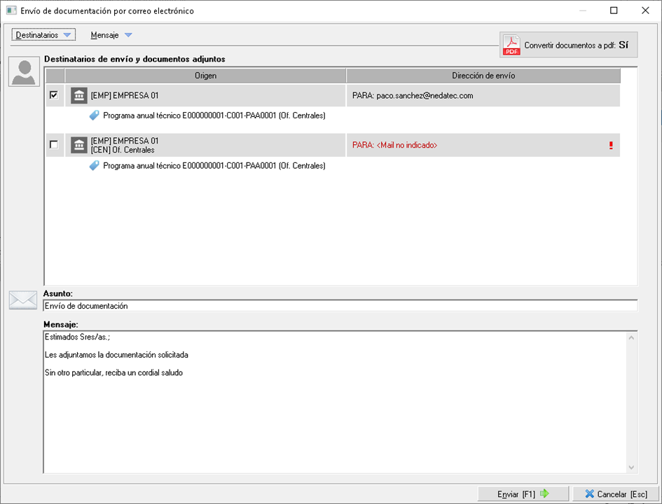 En éste podrá editar los destinatarios por defecto, añadir más destinatarios, configurar la conversión a PDF del documento Word, editar el mensaje...
