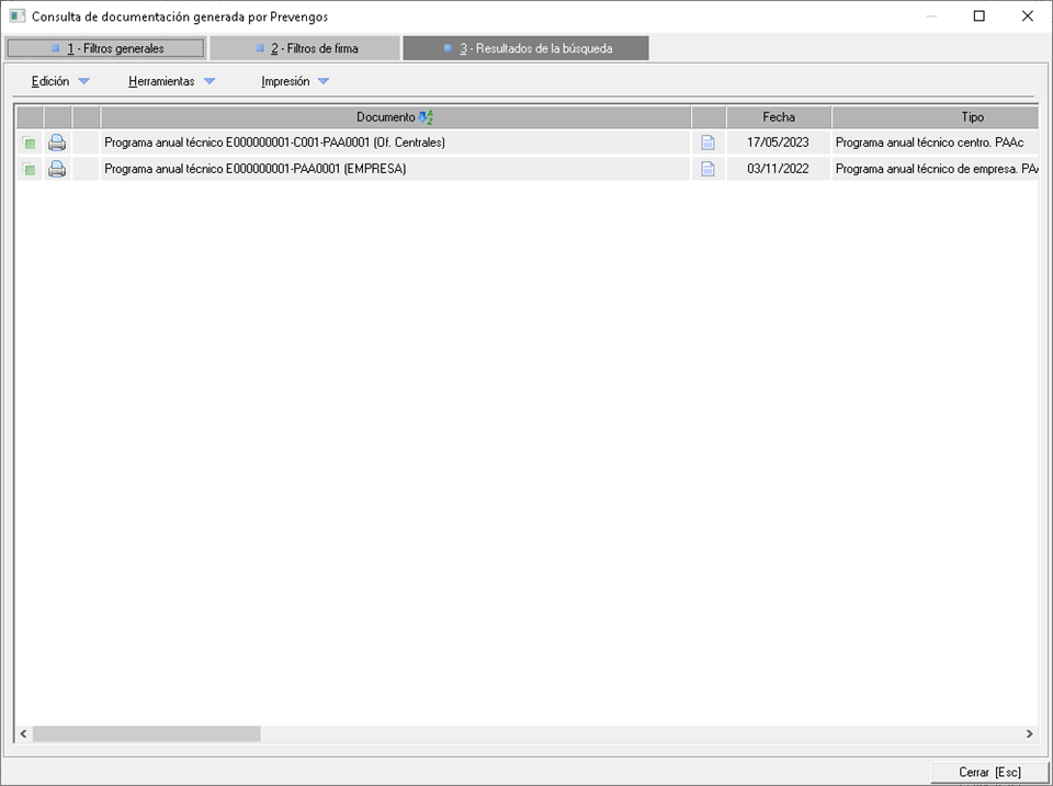 Devuelve un listado, mediante la consulta Consulta de documentos generados por Prevengos, con todos los documentos generados de PAA para la empresa y sus centros.