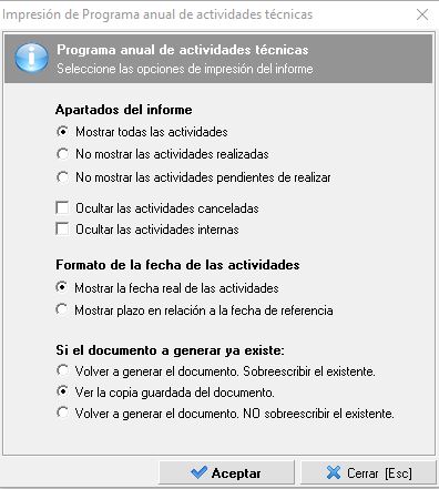 - Apartados del informe donde podemos elegir si incluir todas las actividades, no mostrar las ya realizadas o no mostrar las pendientes de realizar. También podemos marcar para que se oculten las actividades canceladas o internas.
