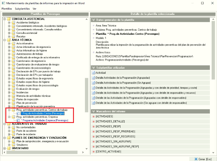 Esta opción se utiliza para generar el informe del PAA en Word. Tras seleccionar la plantilla a usar, Prevengos nos mostrará un esquema de impresión similar a la siguiente imágen: