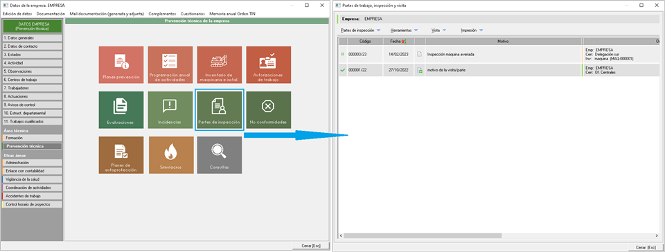 Podemos acceder a ella desde la ficha de la empresa, apartado de prevención técnica de la misma y seleccionando el enlace 'Partes de Inspección', tal y como podemos ver en la siguiente captura: