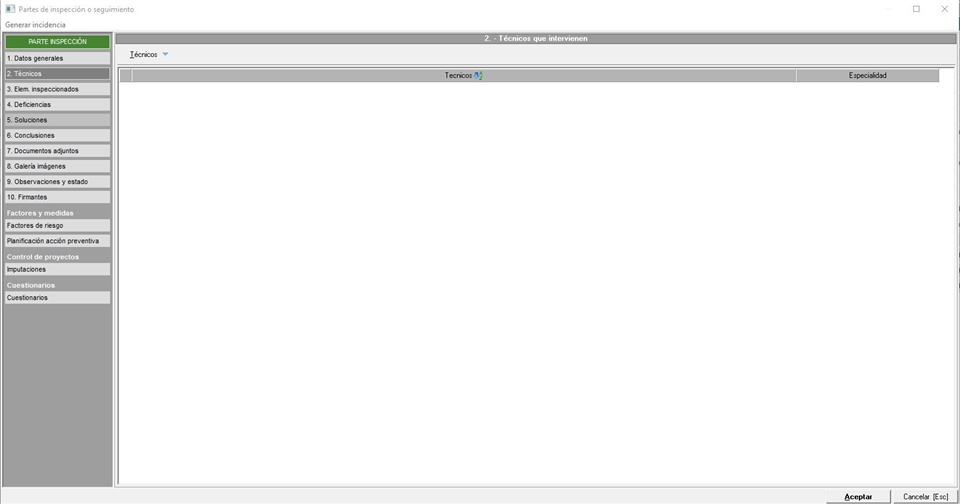 Una vez hayamos creado el parte de inspección desde el desplegable correspondiente, e independientemente de si el parte es de empresa, centro o inventario, se mostrará una ventana similar a la siguiente imagen: