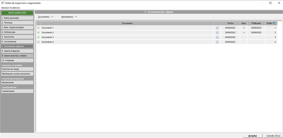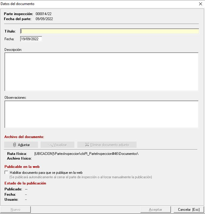 NOTA: Si dispone del módulo web, debe tener en cuenta que los partes de inspección solo se visualizarán en la web cuando estén cerrados, independientemente de que el documento del parte de inspección lo pueda publicar o no.