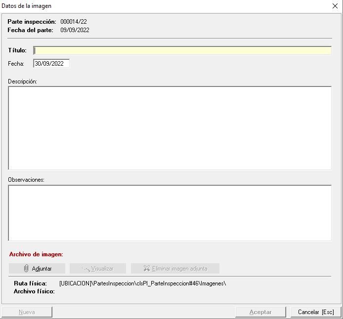 Dentro de este apartado el técnico podrá incluir las fotografías e imágenes relacionadas con el parte de inspección que el técnico considere necesarias, puede utilizarlo, por ejemplo, para aportar fotos de la inspección para presentar evidencias de las deficiencias encontradas. La apariencia de esta pestaña es muy similar a la vista en el apartado anterior, en este caso disponemos del desplegable Imágenes donde encontraremos las opciones necesarias para añadir, editar o eliminar imágenes. En caso de que seleccionaremos la opción de añadir una nueva imagen se nos mostrará la siguiente captura: