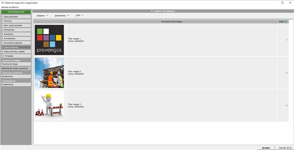 Esta herramienta permite al técnico registrar partes de visita o inspección con el fin de identificar irregularidades, planificar la acción Preventiva o incluso añadir cuestionarios de chequeo sobre elementos (esto último es frecuentemente utilizado para adecuar una máquina al RD 1215). Así, se entiende que el Parte de inspección puede ser usado en un sentido amplio como parte de trabajo, predefiniendo la tipología (vista, auditoría, inspección de máquina) como el usuario desee, tal y como se explica en el punto de datos generales.