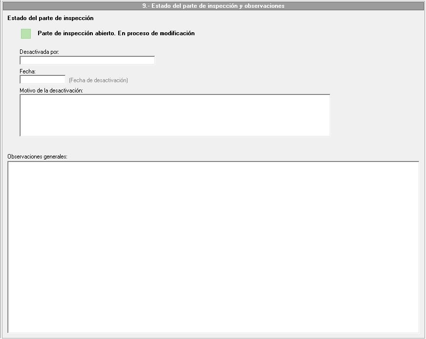 En caso de que el parte de inspección esté cerrado o desactivado podremos ver, en los siguientes campos disponibles, información sobre el usuario que lo ha desactivado, la fecha y el motivo. Por último el técnico dispone del campo de Observaciones generales para poder indicar cualquier aclaración sobre el propio parte.
