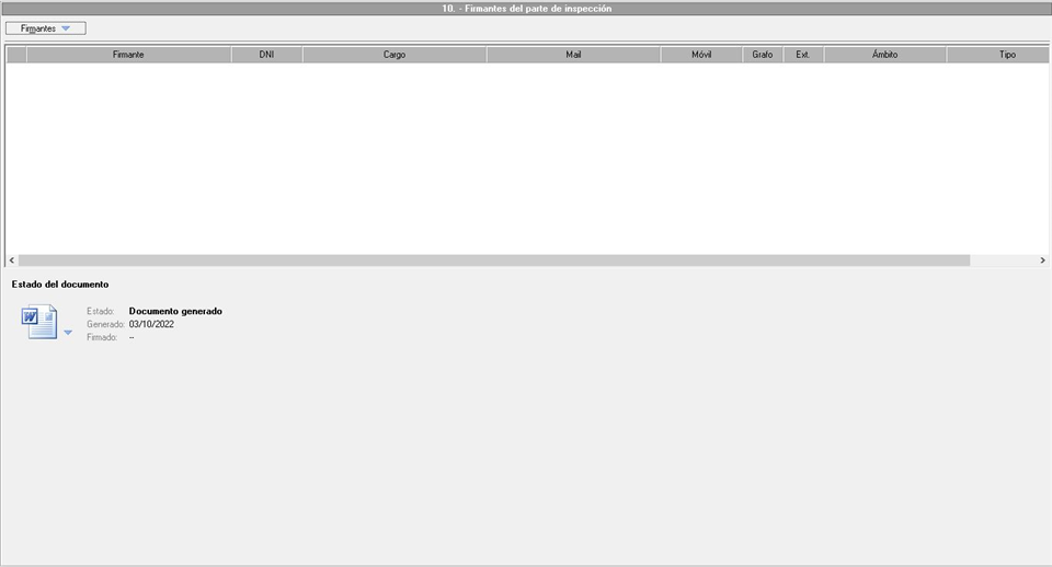 Dentro de esta pestaña veremos todo lo relacionado con los firmantes en el parte de inspección y el estado del documento relacionado con el mismo. La pantalla es similar a la siguiente captura: