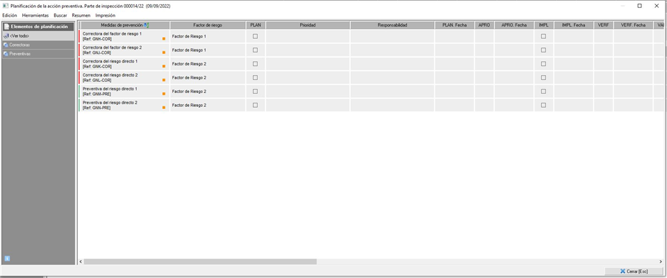 Desde el menú Resumen tendremos acceso a una tabla informativa, donde se indicarán todos los elementos planificables (correctoras, preventivas, EPIs, señales, formación e información) y el estado/fase en el que se encuentran cada una de ellas