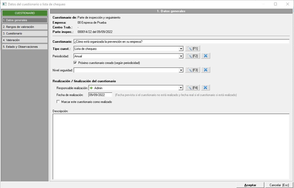 En este apartado encontrarán los datos básicos del cuestionario, algunos de ellos como el nombre y el tipo de cuestionario, la periodicidad o el nivel de seguridad, pueden venir previamente definidos si el cuestionario viene del mantenimiento.