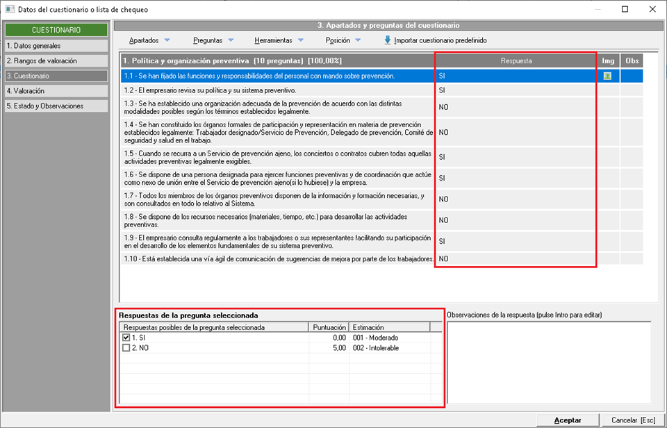 A continuación se calculará la valoración final del cuestionario, la cuál se obtendrá comparando el porcentaje de respuestas de la estimación seleccionada en el campo 'Estimación usada para la valoración', con los rangos definidos. En este caso no se tiene en cuenta el peso de cada apartado.