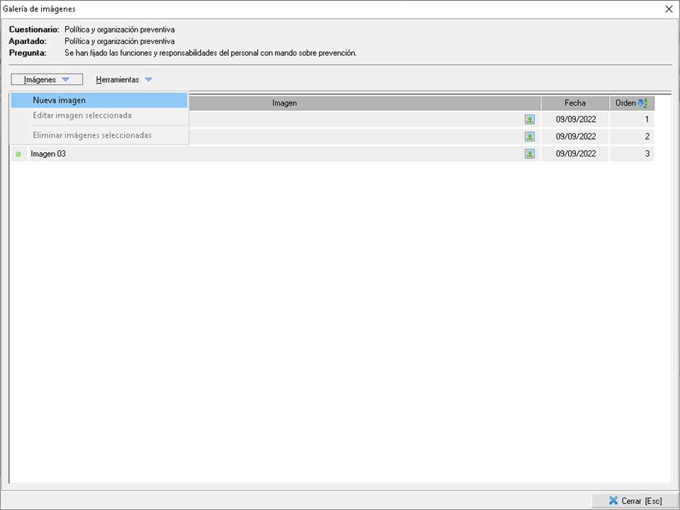 Cada pregunta del cuestionario permite cargar imágenes a una galería desde su ficha de datos con el botón o la tecla F12, en el apartado Imágenes. Si ya tiene imágenes cargadas el apartado las contabiliza y la pantalla anterior habilita el icono para acceder a la galería.