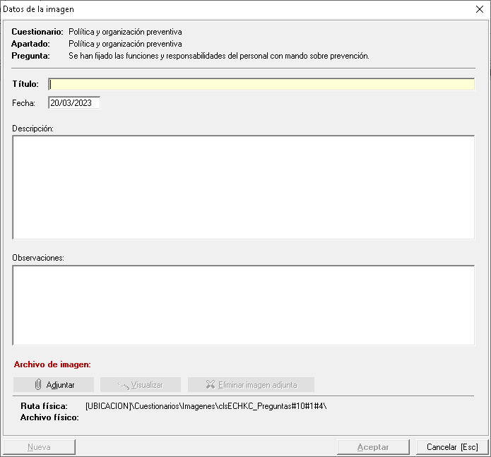 En este caso se añaden los datos de realización del cuestionario como son el responsable de realización, la fecha y la marca de 'Cuestionario realizado'.