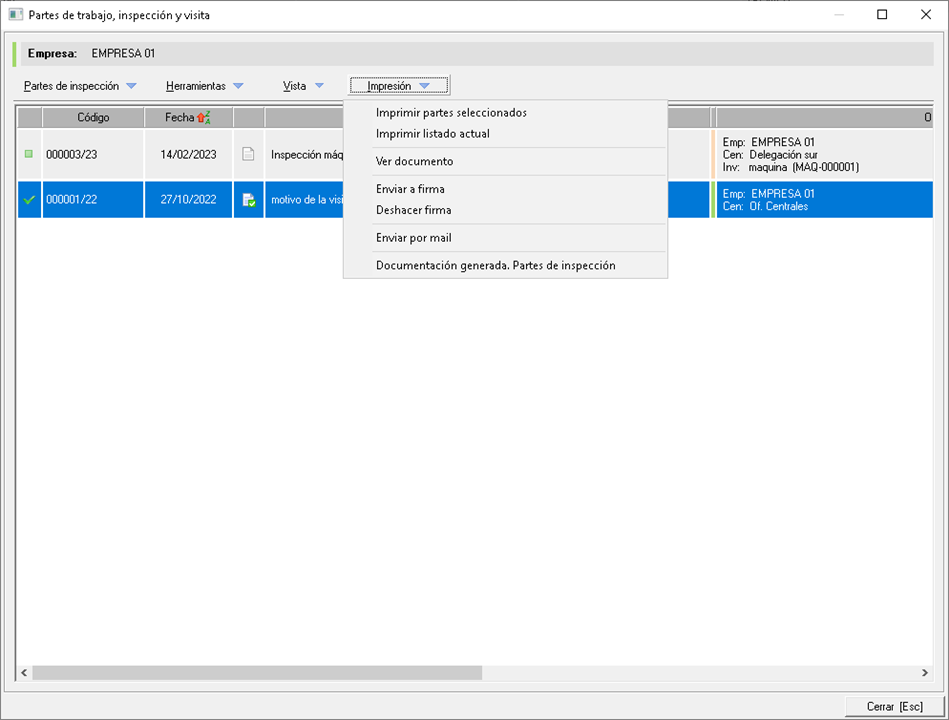 - Ver la copia guardada del documento. Si el parte de inspección ya tenía el documento generado anteriormente se mostrará en el gestor de impresión, si no tiene documento se genera.