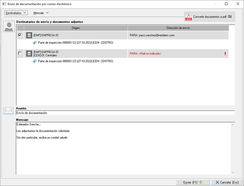 Recuerde que el remitente por defecto será el email principal de la empresa/centro o el email de los contactos que tengan definidos que reciben este correo. Más información en el manual de la ficha de la empresa.