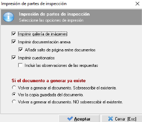 Al ejecutarla generaremos dicho informe para todos aquellos partes de inspección que tengamos seleccionados. Una vez ejecutada se nos mostrará las siguientes opciones de impresión: