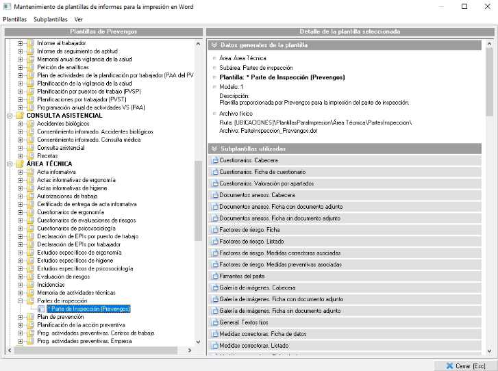 El documento se genera usando una plantilla de impresión que seleccionemos en el momento de generar el informe (si solo tenemos una plantilla la coge automáticamente). Estas plantillas las encontramos en el mantenimiento de plantillas, llamado "Plantillas de Impresión de Documentos de Word" situado en el menú superior "Documentos y cuestionarios" de la pantalla principal de Prevengos. La plantilla correspondiente a los partes de inspección la vemos resaltada en la siguiente imagen: