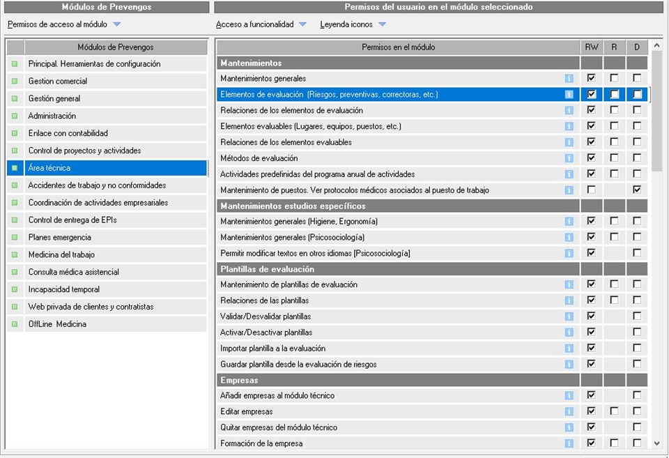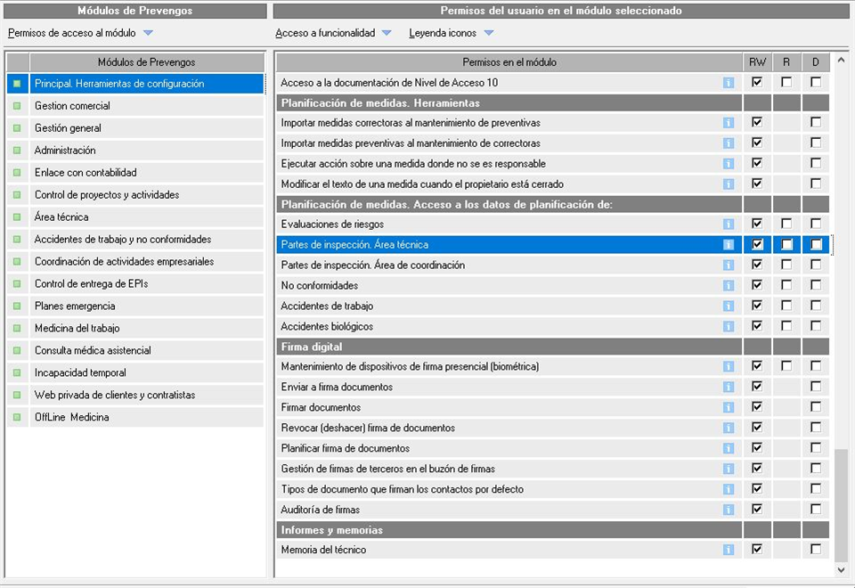 • Con el permiso en posición RW damos acceso total a los mantenimientos de factores de riesgo, medidas correctoras y medidas preventivas, de tal manera que podrá añadir estos elementos al parte de inspección y, a parte, tendrá posibilidad de crear, editar o eliminar elementos dentro de estos mantenimientos