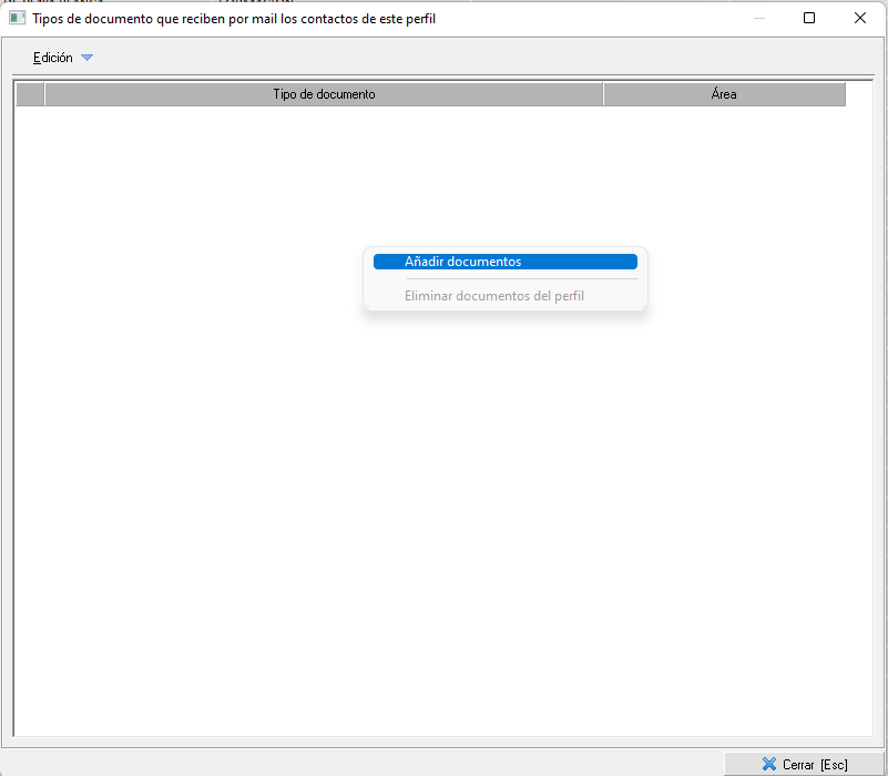 Como puede ver en la pantalla superior, podrá configurar para todos los contactos que pertenezcan a este perfil que tipos de documentos reciben por defecto. Si no tiene ningún documento vinculado al perfil el botón 'Tipos de documentos que recibe por mail' se muestra en gris , en el momento que vincule algún documento el botón se mostrará en verde . Para añadir o quitar tipos de documentos vinculados al perfil solo debe pinchar en el botón y mostrará el listado de tipos ya vinculados. Si quiere añadir nuevos tipos, pulse en el botón 'Edición->Añadir documentos' o con botón derecho del ratón.