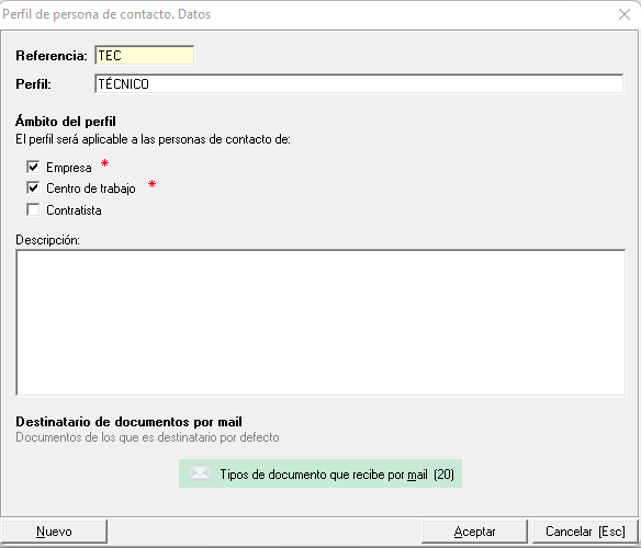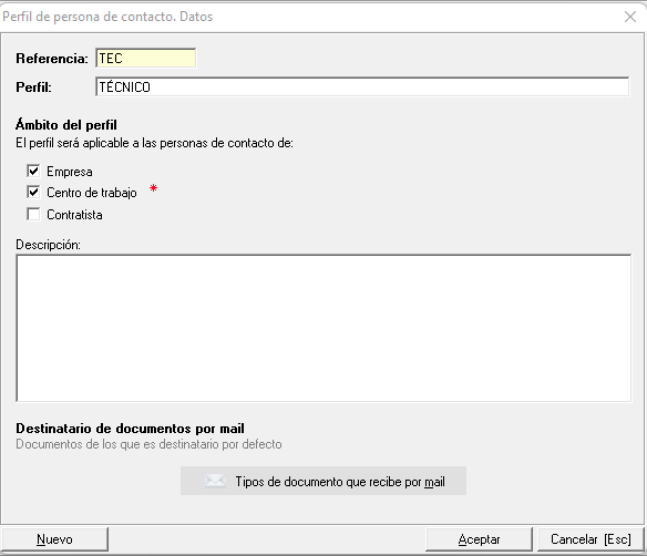 Los perfiles podrán configurarse para que puedan vincularse contactos de empresa, centro y/o contrata, de esta forma si configura que un perfil es para contactos de empresa, cuando esté creando contactos de contrata este perfil no le aparecerá entre las opciones. Esto lo veremos con más detalle a continuación.