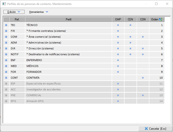 Como puede ver en la imagen superior, con las columnas 'EMP', 'CEN' y 'CON' podemos ver cada perfil para contactos se puede aplicar, por ejemplo, el perfil 'Técnico' solo podrá vincularse a contactos de empresas y centros, mientras que el perfil 'Dirección' podrá asociarse a contactos de empresas, centros y contratas.