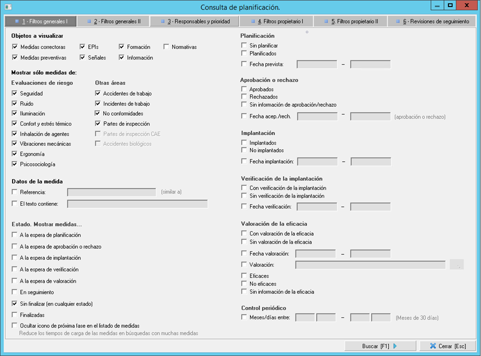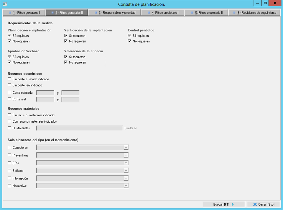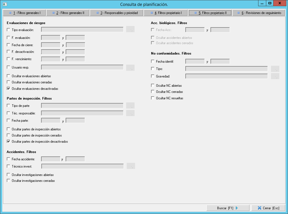 - Pestaña 5. Filtros propietario II. En esta segunda pestaña de filtros de propietarios podrán filtrar por datos concretos de los informes en los que se han planificado las medidas que quieren localizar, como pueden ser las fechas de una evaluación, el tipo de parte de inspección, el técnico investigador de un accidente, etc.