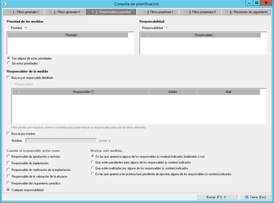 - Pestaña 3. Responsables y prioridad. Este apartado contiene filtros relacionados con la prioridad y los responsables asociados con la medida. Como una medida puede pasar por varios estados, y en cada estado puede haber responsables diferentes, se incluyen filtros con los que indicar si el responsable por el que se está filtrando, es responsable en un estado concreto de la medida.