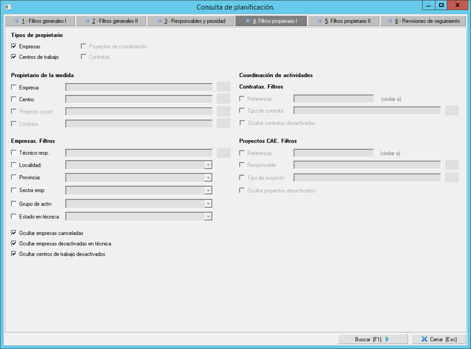 - Pestaña 4. Filtros propietario I. Como hemos comentado en el punto anterior, en esta pestaña podremos filtrar por la entidad propietaria del elemento planificado, por ejemplo, la empresa o la contrata.