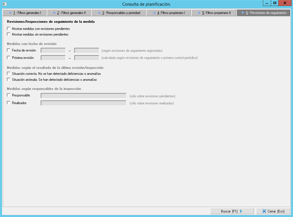 - Pestaña 6. Revisiones de seguimiento. En esta pestaña el usuario podrá aplicar filtros relacionados con las revisiones de seguimiento planificadas en las medidas.