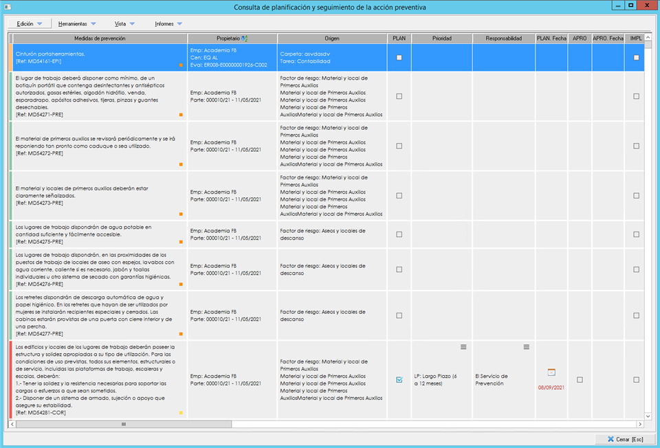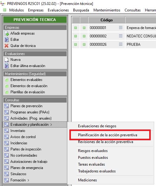 - Desde el bloque 'Consultas' que encontrará en la parte izquierda de la pantalla, dentro de este mismo módulo, pulsando en la opción 'Evaluación y planificación' y seleccionando a continuación la opción de 'Planificación de la acción preventiva'.