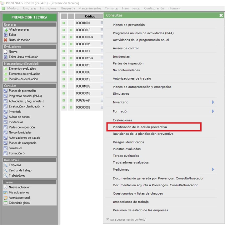 - Desde el menú desplegable 'Consultas' ubicado en la parte superior de la pantalla principal del módulo técnico, pulsando sobre la opción 'Planificación de la acción preventiva'.