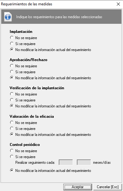 En el momento en el que el usuario intenta cambiar los requerimientos de una medida, debe tener en cuenta que algunos requerimientos dependen de otros, por ejemplo, no se puede indicar que una medida requiere 'aprobación/rechazo' si en esa medida no se ha requerido la 'implantación' de la misma.
