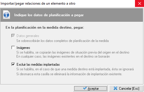Al ejecutar la acción de 'Pegar planificación', aparecerá un formulario como el que vemos a continuación. En el cuál el usuario podrá indicar si quiere copiar las imágenes, o si quiere eliminar del proceso las medidas seleccionadas que estén implantadas.