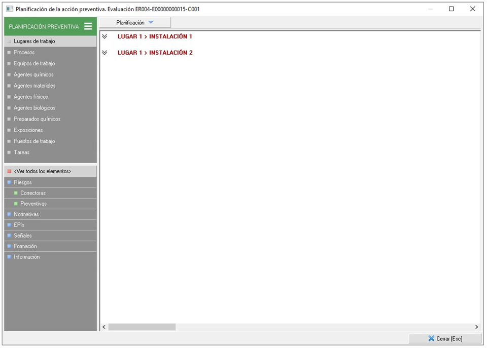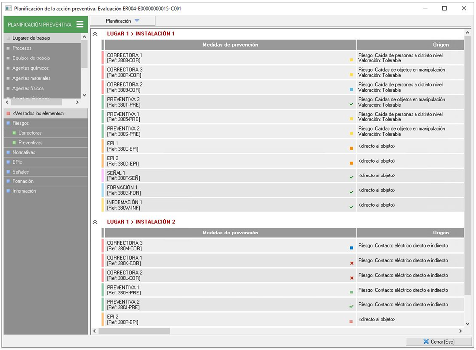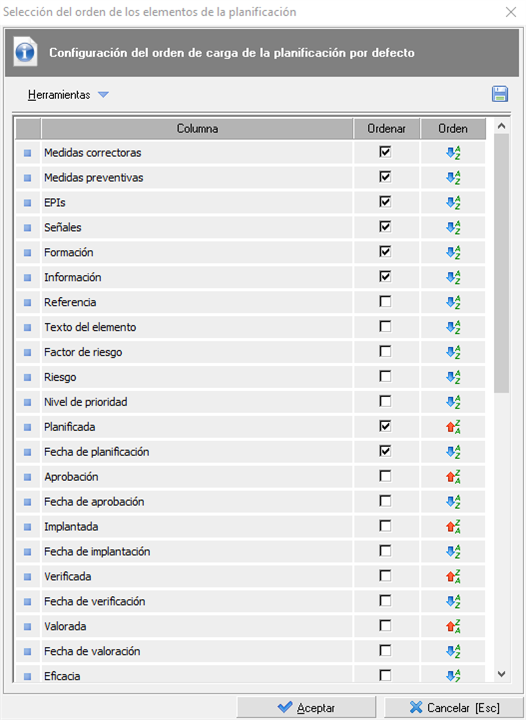 - El orden se aplicará en pantalla según el orden en el que hayamos dejado los campos en pantalla, por lo tanto, según la imagen, primero aparecerán las medidas correctoras, después las preventivas, a continuación los EPIs, etc; después de ordenar los elementos planificados, pasará a ordenar por los datos de los mismos. En el ejemplo, primero ordenará por el campo 'Planificada' y después por la fecha de planificación.