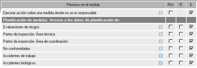 - R -> Con este permiso en R, el usuario podrá acceder a la planificación preventiva de accidentes de trabajo en solo lectura. Aquí es donde entra en juego el permiso "Ejecutar acción sobre una medida donde no se es responsable", si este está en D solo podrá ejectuar las fases en las que es responsable, si está en RW podrá ejecutar todas las fases, independientemente de si es responsable o no. Nunca podrá planificar.