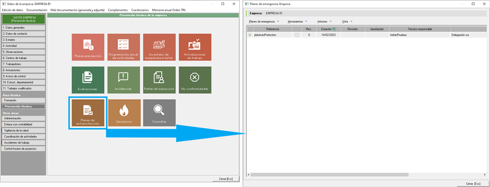 En este manual explicaremos como gestionar la creación de un Plan de Emergencias o Plan de Autoprotección, herramienta que encontramos dentro del área de Prevención Técnica en la ficha de la empresa, cuando accedemos a ella desde el módulo Técnico. Hay que destacar que tanto si quiere hacer un plan de emergencia o uno de autoprotección debe hacerlo en el siguiente apartado, la diferencia estará en la generación del documento ya que al generar el informe son plantillas distintas, ya que el plan de autoprotección tiene unos apartados definidos según la normativa y para el plan de emergencia puede elegir que apartados quiere incluir en el informe, más información en el manual de informes.