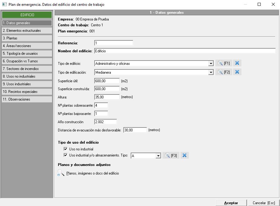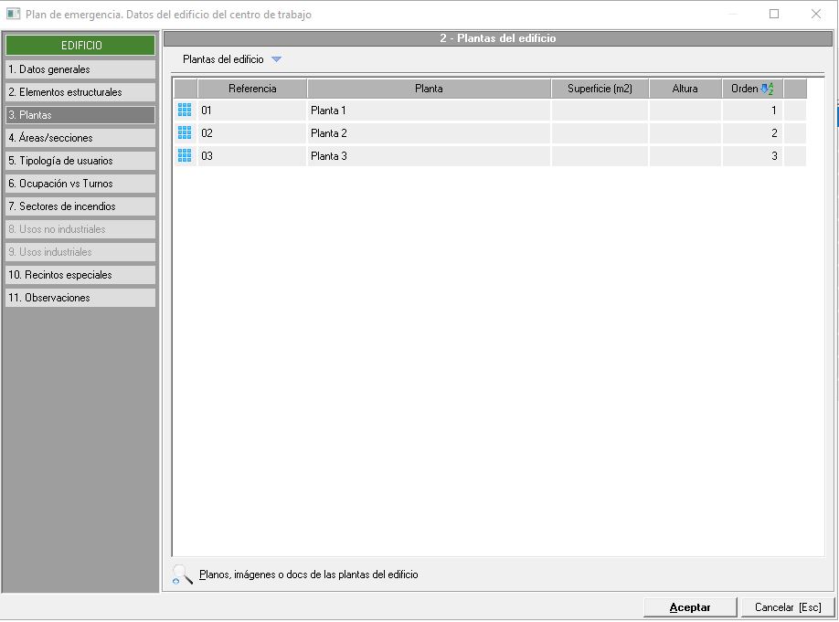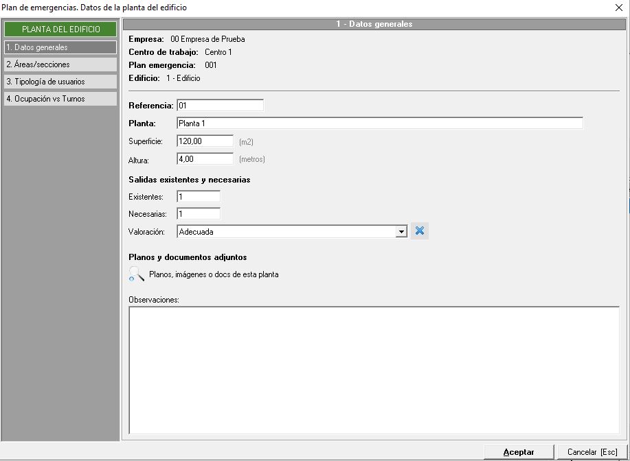 - Datos generales. Indicaremos los datos sobre la planta con el número de referencia, nombre de la planta, superficie de la misma, altura, salidas existentes y necesarias (con valoración). También podemos adjuntar documentos externos como planos o imágenes.
