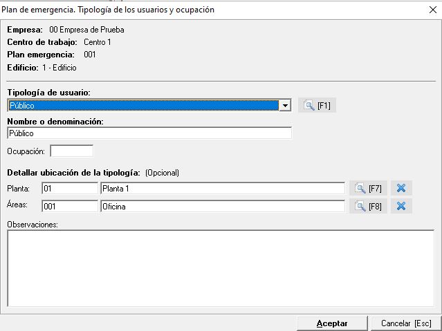 Dentro de este apartado indicaremos la tipología de los usuarios que van a estar en la planta y sección que nosotros indiquemos. Este dato viene de su correspondiente mantenimiento e indicaremos que tipo de usuarios se pueden encontrar en cada zona, a modo de ejemplo, si existe una sala de espera podemos indicar que esta sección tiene una tipología de "público". Una vez establezcamos el tipo podemos indicar un nombre o denominación, la ocupación de la misma así como la ubicación donde se encuentra (planta y área) tal y como vemos en la siguiente imagen: