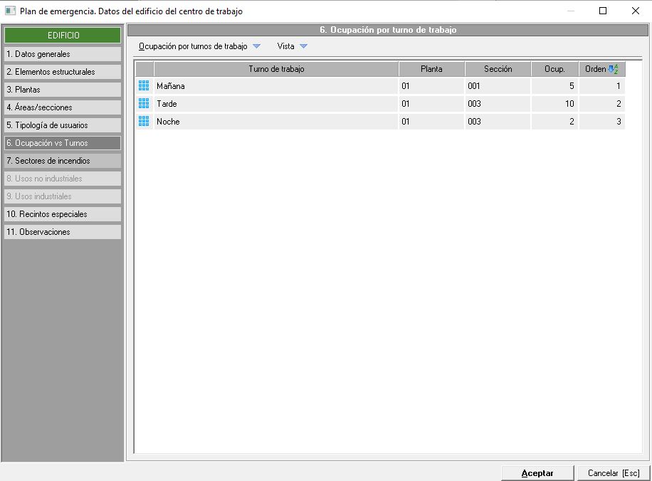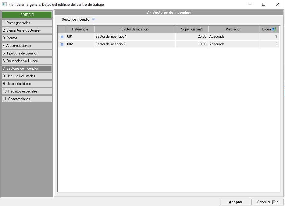 En este apartado indicaremos los sectores de incendios existentes en el centro de trabajo para evitar la propagación de un incendio en caso de producirse. Veremos este apartado en una pantalla similar a la siguiente imagen: