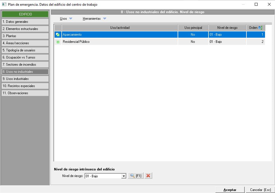 Una vez que añadimos los usos, de su correspondiente mantenimiento, debemos de establecer el nivel de riesgo de cada uno así como marcarlo como principal, si procede, usando el desplegable "Herramientas" para ello. Finalmente tenemos en la parte inferior un desplegable para asignar el nivel de riesgo intrínseco del edificio.