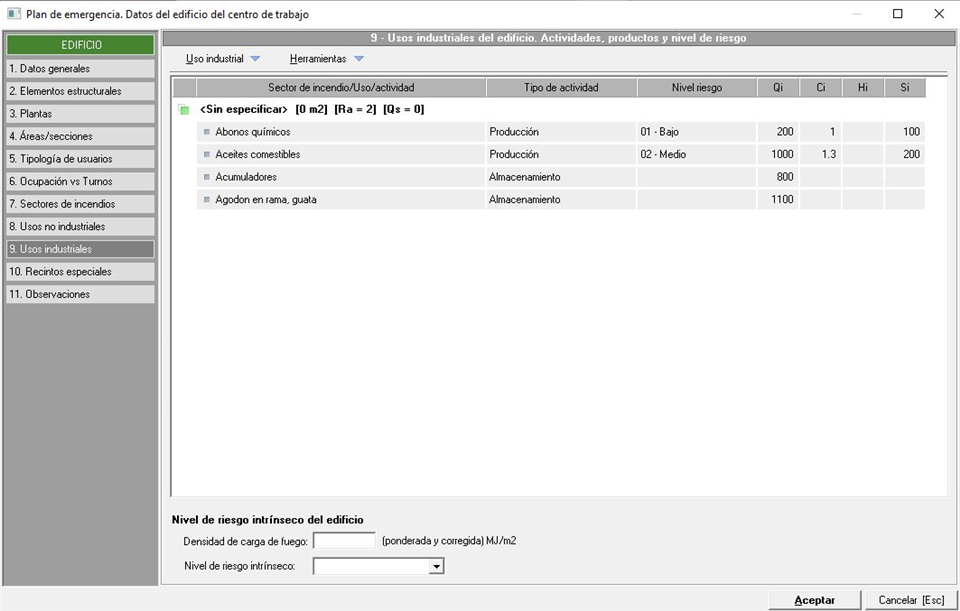 Una vez tengamos las actividades definidas, Prevengos nos calculará la densidad de carga de fuego correspondiente al nivel de riesgo intrínseco del edificio, el cual podemos ver en la parte inferior de la pantalla.