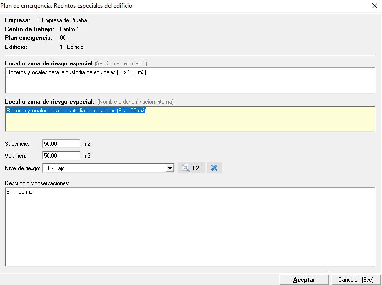 Desde el desplegable "Recintos especiales" seleccionaremos los elementos que queremos añadir desde el mantenimiento de locales y zonas de riesgo especial. Una vez añadido, si hacemos doble clic sobre los mismos se nos muestra los datos del recinto donde debemos de indicar la superficie, volumen y nivel de riesgo, quedando una pantalla similar a la siguiente imagen: