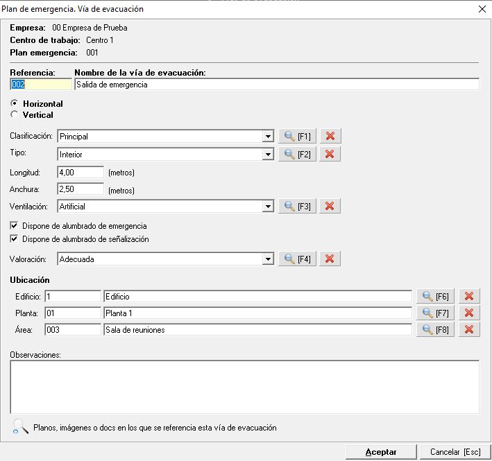 Como podemos apreciar, en la vía de evacuación indicamos un número de referencia y un nombre para la propia vía, estableciendo si es horizontal o vertical. Seguidamente pondremos una clasificación (principal, alternativa), un tipo (interior, exterior,..), longitud, anchura y ventilación (artificial o natural). Marcaremos si dispone de alumbrado y/o alumbrado de emergencia y el técnico podrá establecer una valoración.