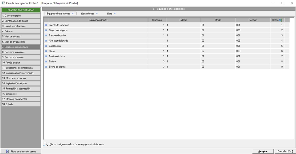 En este apartado gestionaremos los equipos e instalaciones existentes en el centro de trabajo en una pestaña similar a la siguiente imagen: