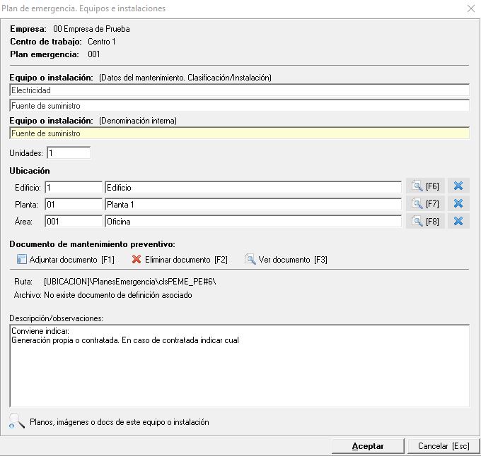 Aunque los elementos se añaden de su correspondiente mantenimiento, desde esta ventana podemos modificar el nombre del Equipo o instalación (tanto en el mantenimiento como de manera interna), la cantidad de unidades existentes así como la ubicación donde se encuentra en el centro de trabajo (edificio, planta y sección). Seguidamente podemos añadir el documento relativo al mantenimiento preventivo, establecer una descripción u observaciones y como en la mayoría de herramientas asignar planos, imágenes o documentos relativos al equipo.