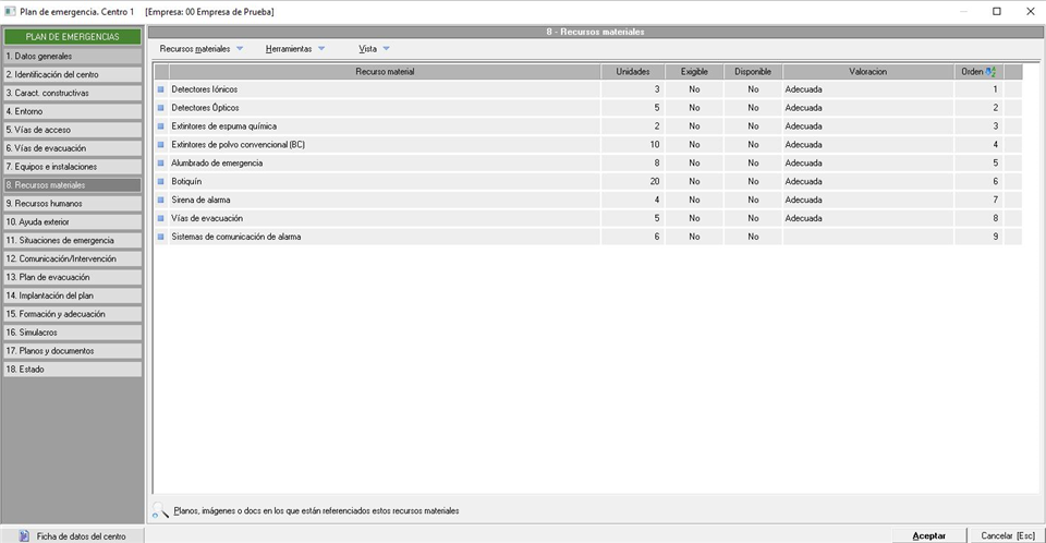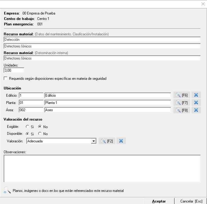Como podemos ver, nos indicará el nombre del recurso material tanto en el mantenimiento como su denominación interna (esta última editable) seguido de las unidades disponibles y un check donde indicamos si es requerido según disposiciones específicas en materia de seguridad. En el siguiente apartado indicaremos la ubicación del recurso (edificio, planta y sección) y la valoración del mismo (si es exigible, si está disponible y que valoración tiene). Por último, en la parte inferior, podemos indicar observaciones sobre el mismo e insertar planos, documentos o imágenes relacionadas con él.